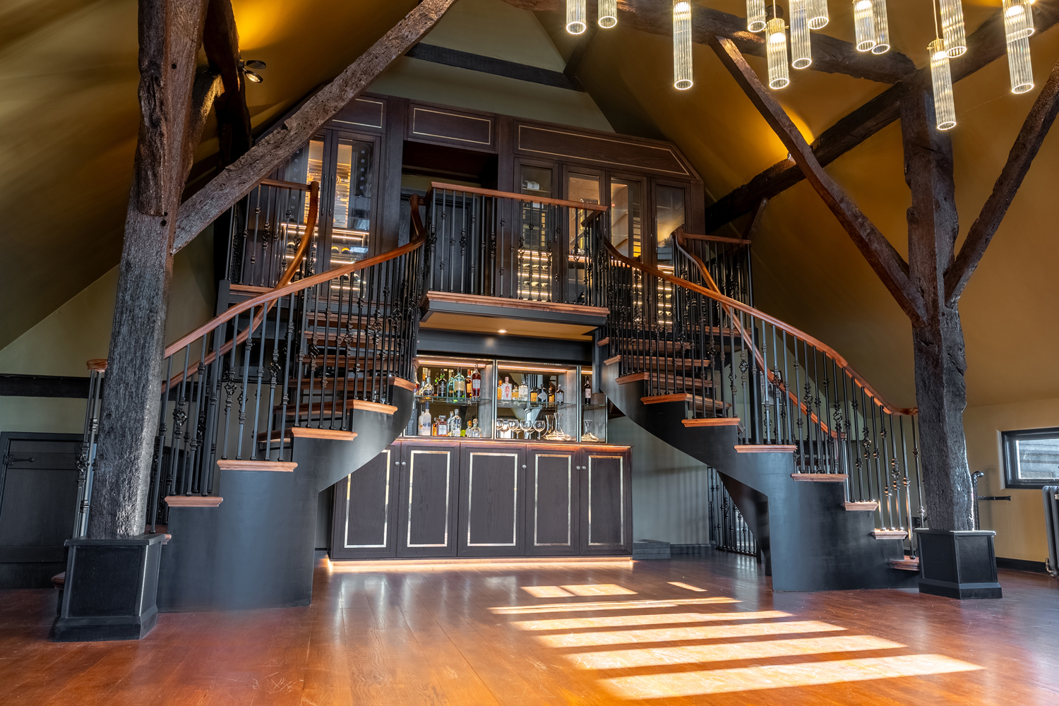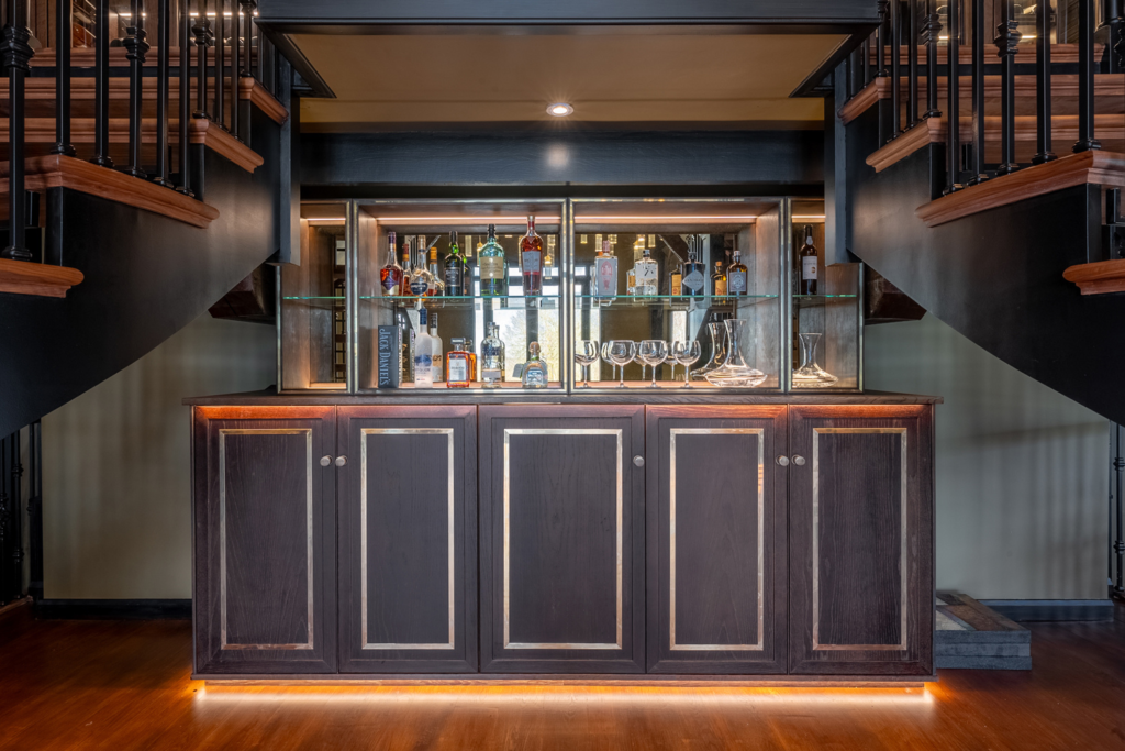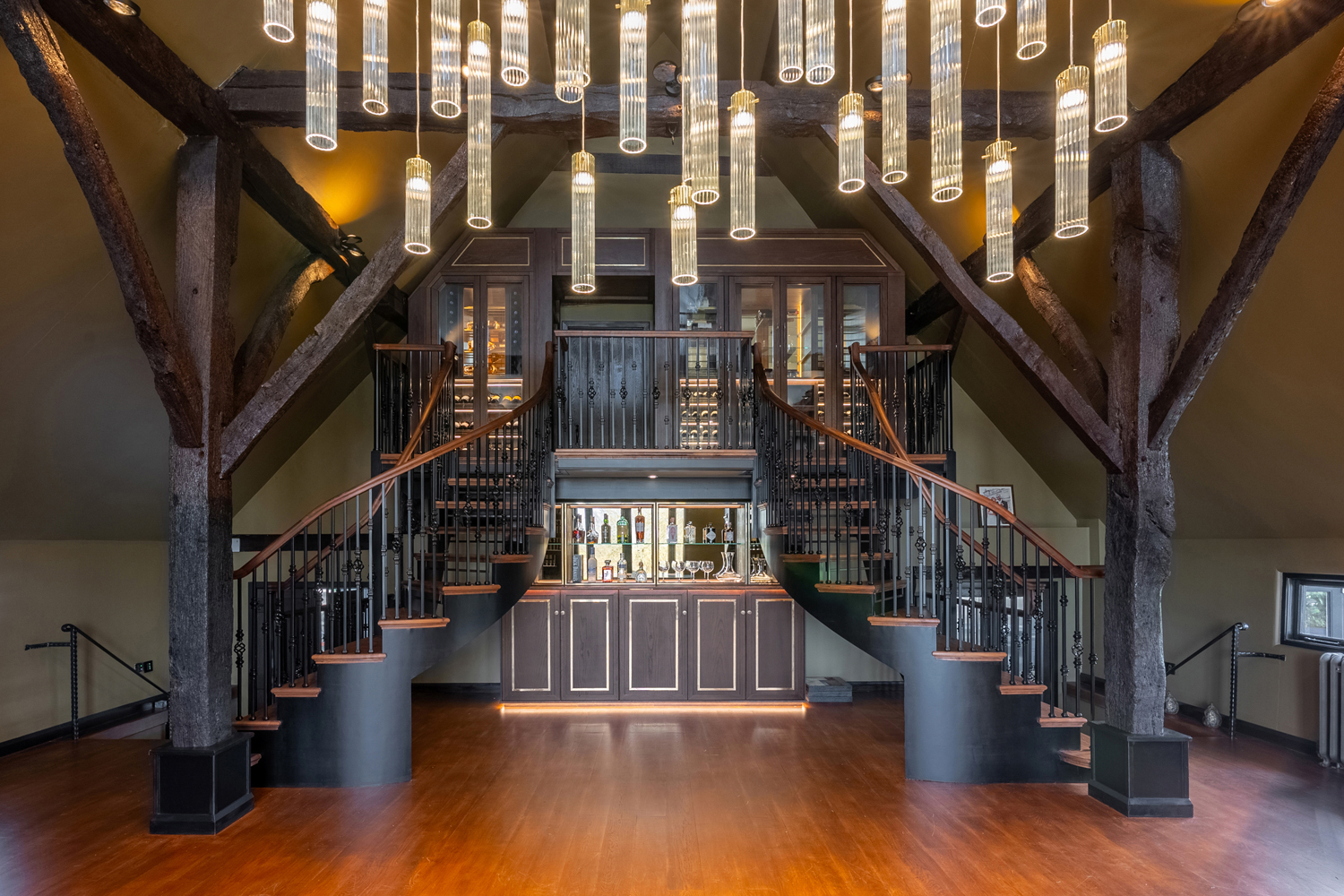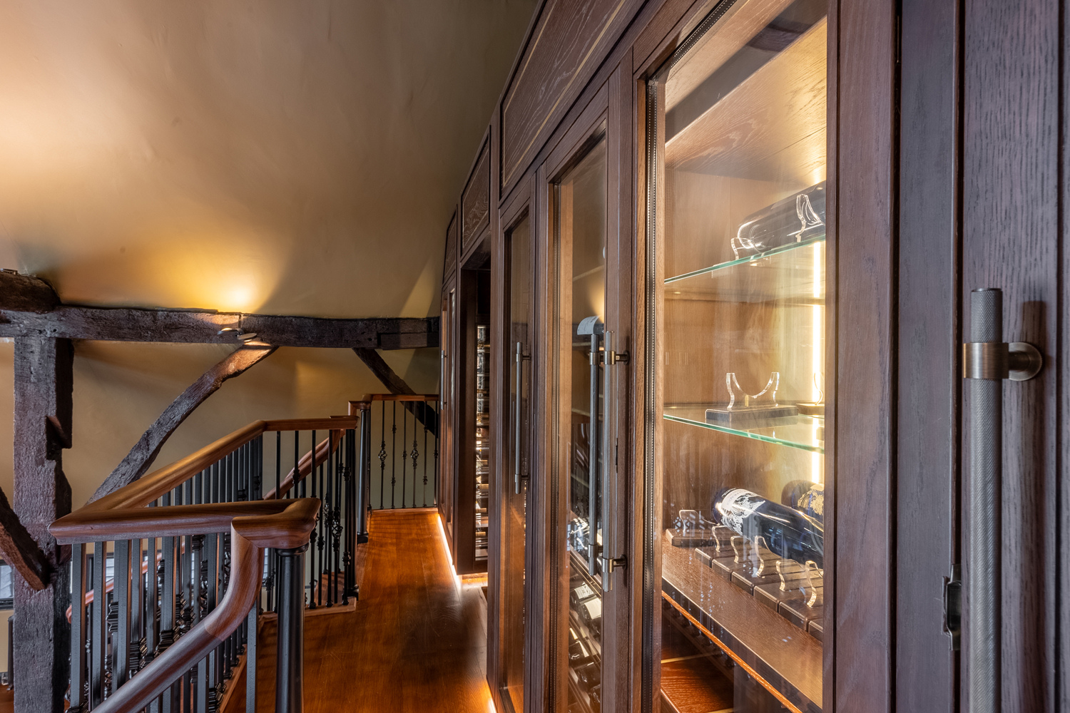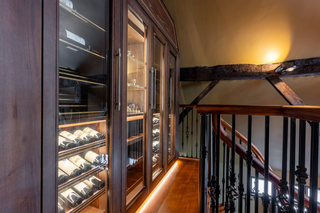 This project involved the design and installation of a bespoke, double-story home bar and wine wall for a private residence in Essex. The client required a solution that would respect the property’s rustic character while transforming an underused area into a new space to socialise and entertain. The lower ground level provides a home bar for informal gatherings, while the upper level houses temperature-controlled cabinets designed for long-term fine wine storage.