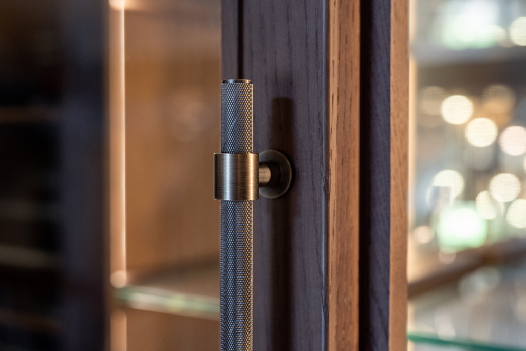 The design features dark hues to complement the property’s existing interior and exposed beams. As a striking yet neutral contrast, bronze detailing has been used throughout the installation to add refinement without overpowering the space. A notable feature is the bronze inlay detailing on the cabinetry doors and plinths, providing subtle highlights that draw the eye while maintaining overall cohesion. Bronze has also been used for the door handles and ironmongery, introducing consistent, understated touches that tie the entire scheme together.