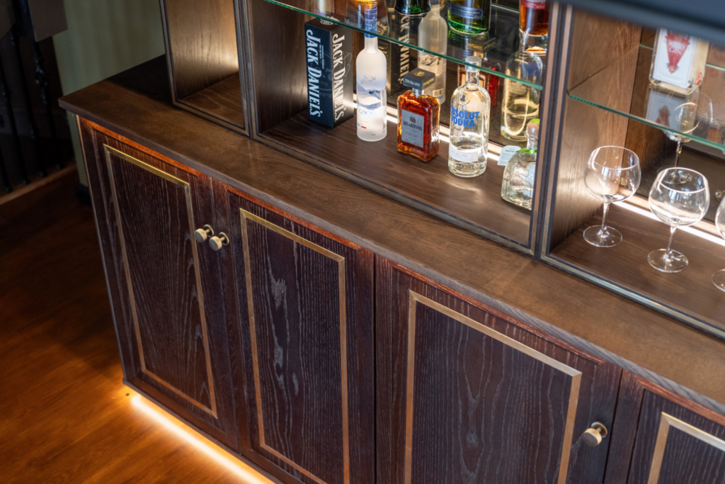 In the lower home bar, shelving was introduced in place of traditional wine racking at the client’s request, to provide a dedicated space for displaying spirits. The display shelving ensures easy access to spirits and wine accessories, keeping everything within reach for entertaining. The use of glass shelving provides a deliberate contrast against the darker oak joinery, adding a sense of lightness and enhancing the reflective quality of the mirror backing behind the bar.