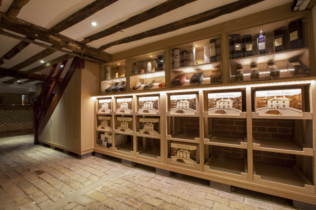 Rather than imposing a new structure, the design works sympathetically with the building’s natural form. Original architectural features are celebrated rather than concealed, reinforcing a sense of authenticity throughout the cellar. An existing alcove was elevated into a defining design feature, housing bespoke wine racking and joinery crafted precisely to suit the proportions of the heritage setting. At the centre of the cellar, a projecting tasting station forms the focal point of the space. A cascading bottle display has been integrated into the station, allowing bottles to flow outward in a layered, sculptural arrangement that adds depth and movement.
