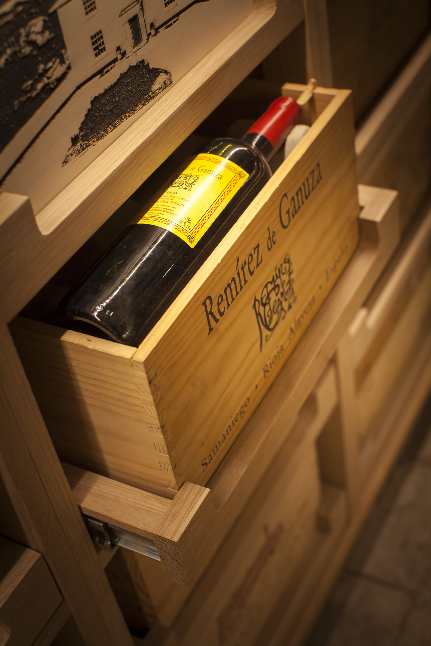 90 bottles stored within a range of different wine rack styles. Plenty of space for wine by the case has been provided and additional storage in the form of bespoke cabinets have been crafted for Whiskeys.
