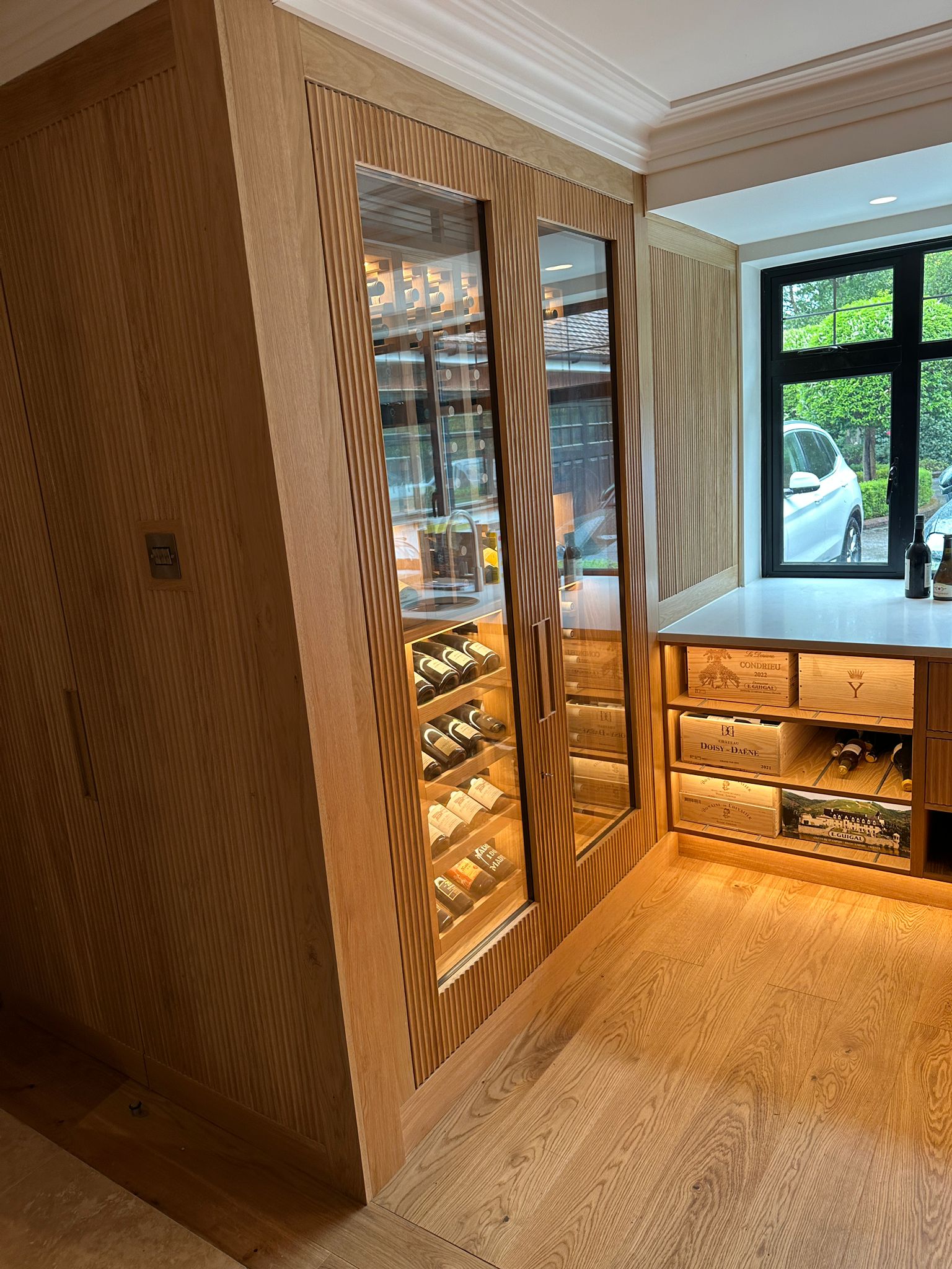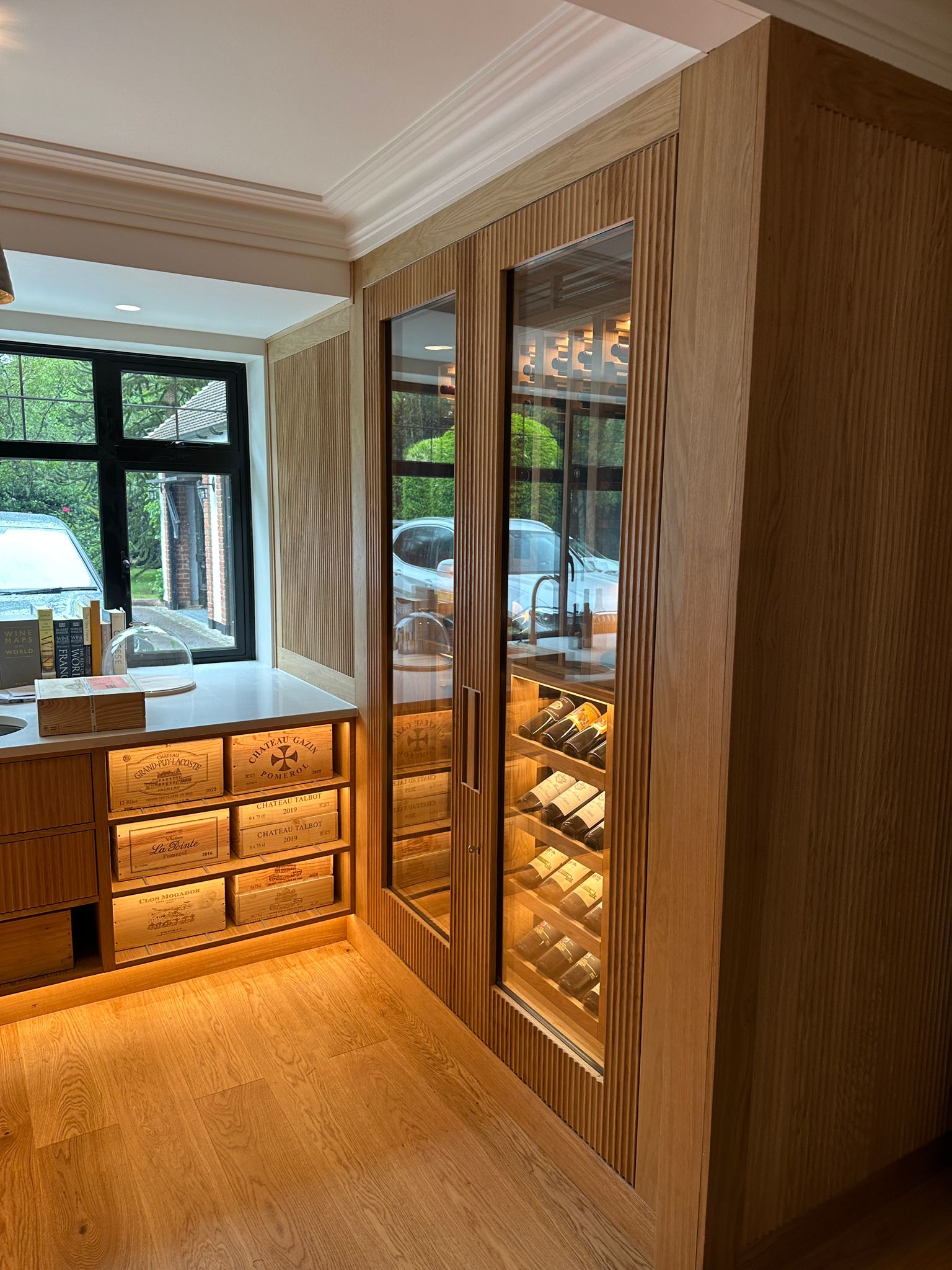 On either side, reeded timber doors with brushed bronze ironmongery sit in front of angled racking that showcases labels, with standard racking above for single bottles. Constructed in oak with a clear lacquer, the cabinetry is finished throughout with satin chrome ironmongery, Milano fluted panelling, and discreet LED lighting. Temperature is maintained at 13–15°C via wall-mounted control units, securing the long-term storage of fine wine.