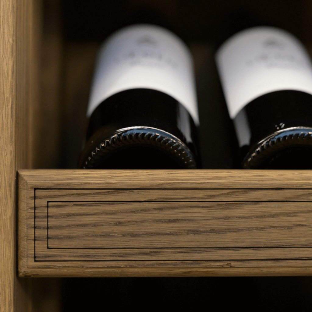 Sorrells was appointed to design and manufacture a fully bespoke oak wine wall, tailored to the space and crafted to enhance the experience of guests dining and entertaining on-site. Positioned within one of the lodge’s key social spaces, the wine wall is more than a storage solution, it is an architectural feature that reinforces the tone of the room and the traditions of the estate.