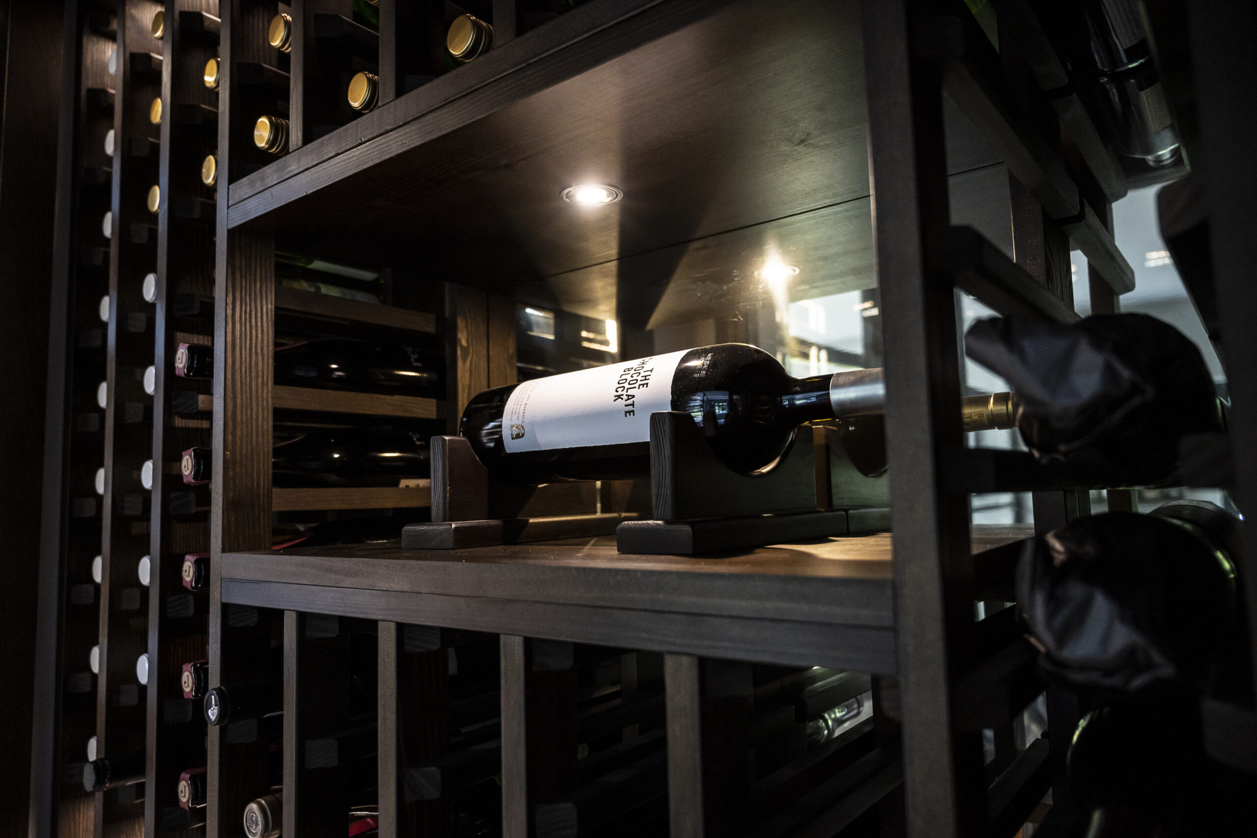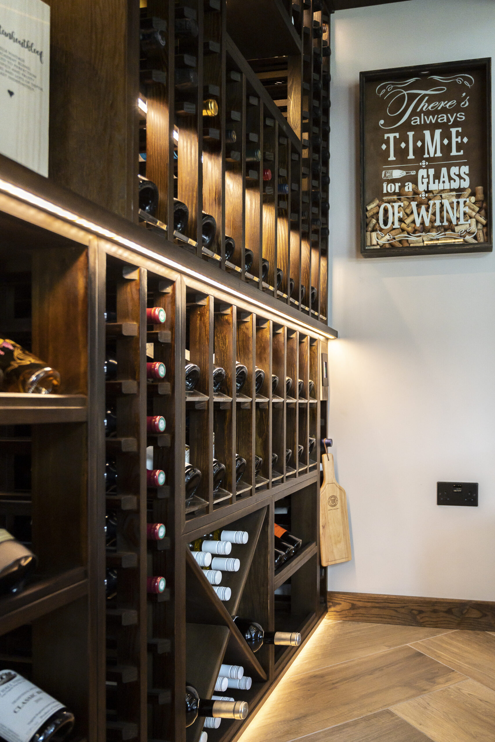 A glass fronted wine wall with feature panelling and side viewing window. Created from redwood with soft integrated LED lighting to compliment the current interior features within the space. Storage includes both high capacity, standard racking, as well as a central display space, including shelving for standing bottles and wine accessories.