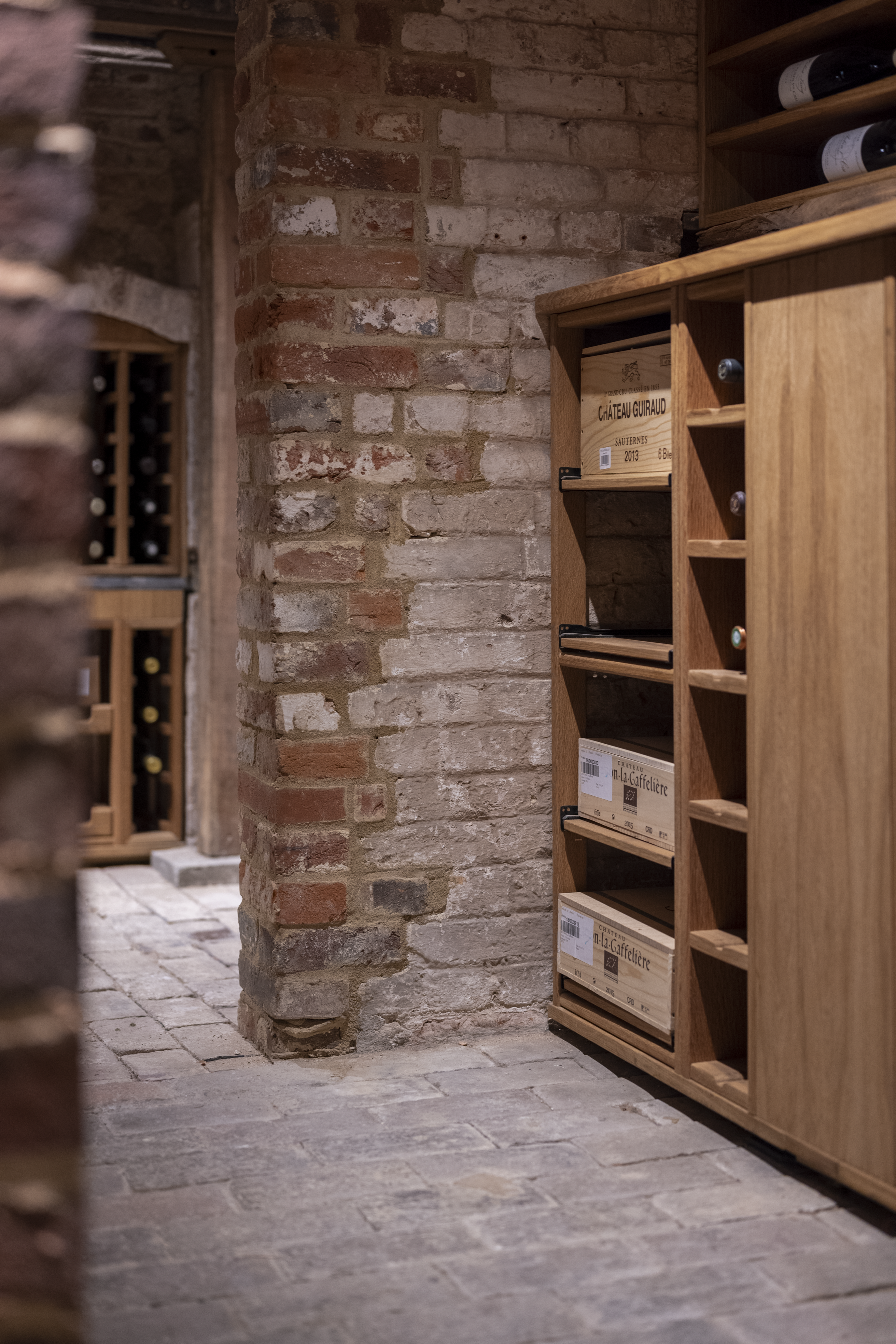 Located within the basement of a listed country property, this grand wine cellar has been thoughtfully reimagined to honour the building’s heritage while delivering exceptional functionality and tailored design. Once a working wine cellar with dated, off-the-shelf racking, the space lacked cohesion and failed to reflect the quality of the collection it housed. The previous joinery didn’t follow the contours of the room, leaving voids and awkward gaps against the irregular brickwork and curved alcoves.