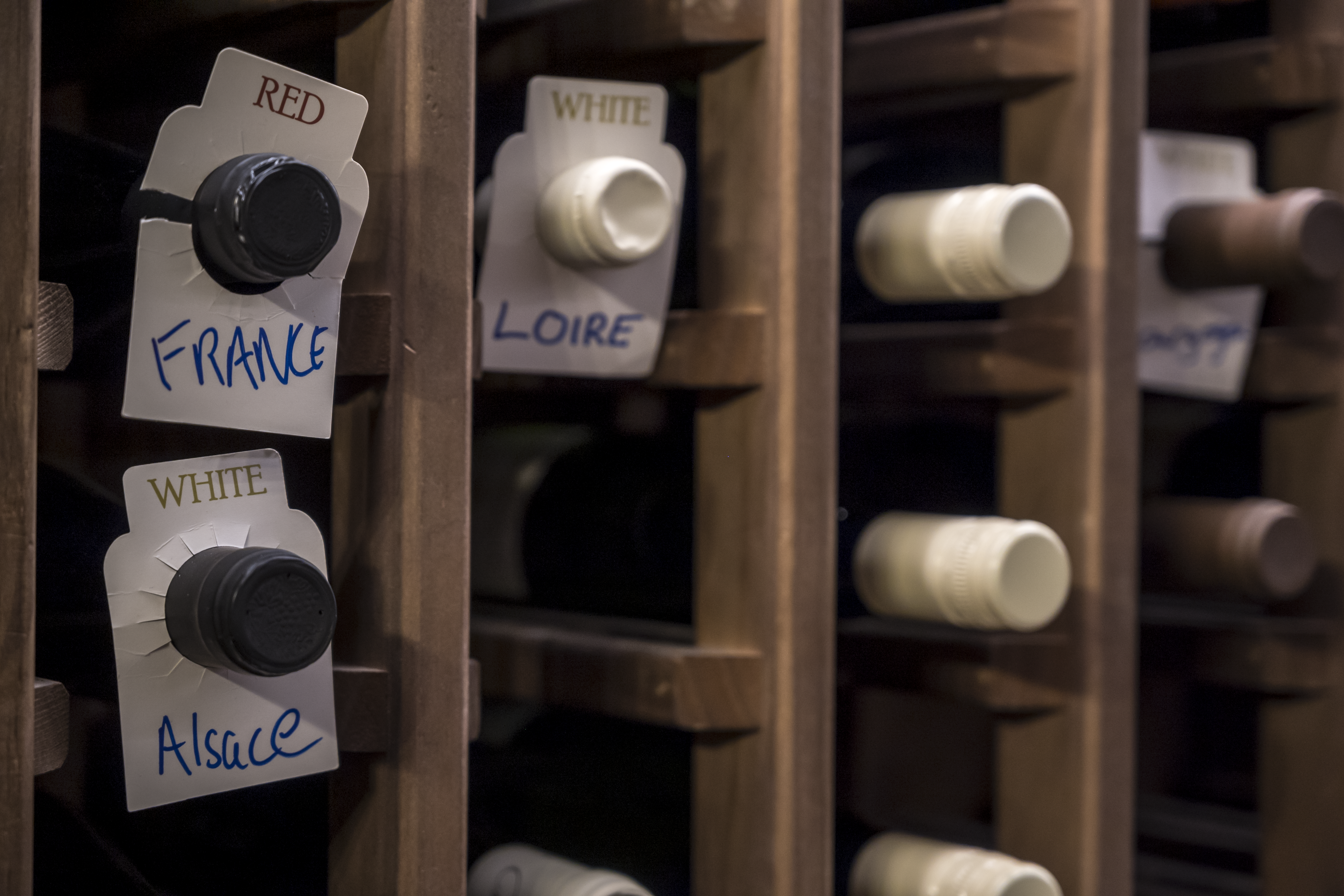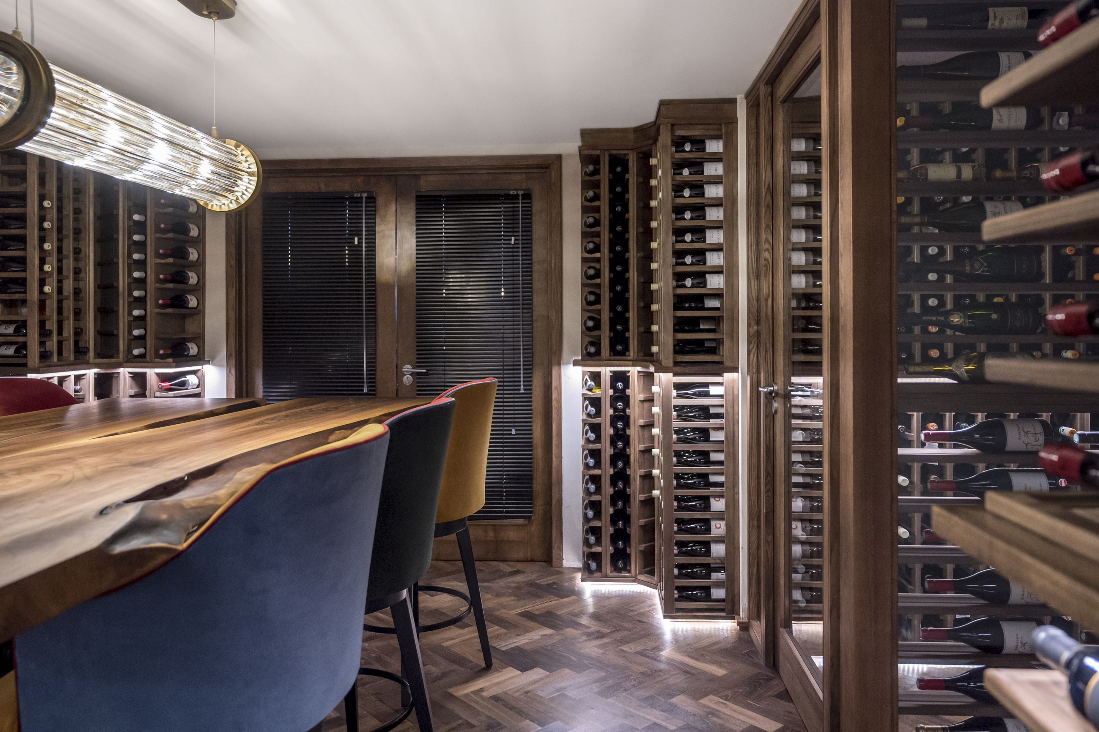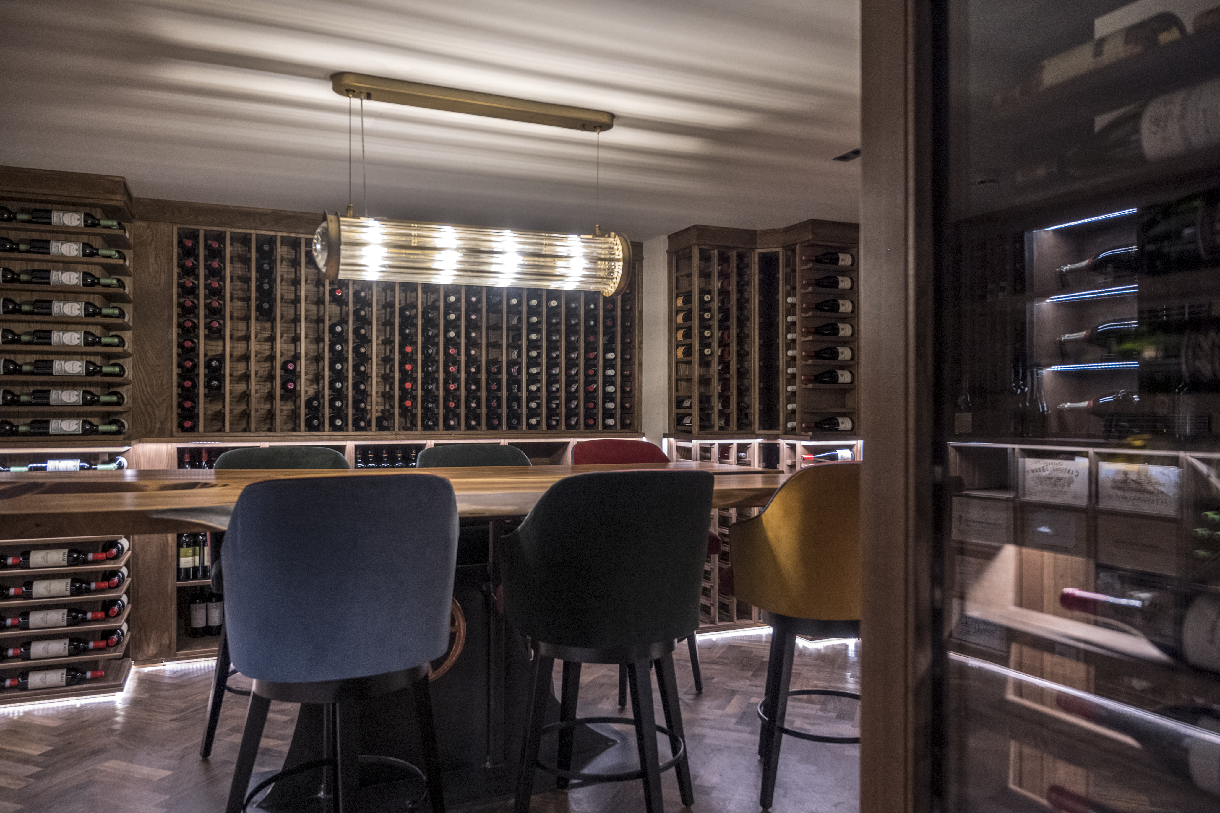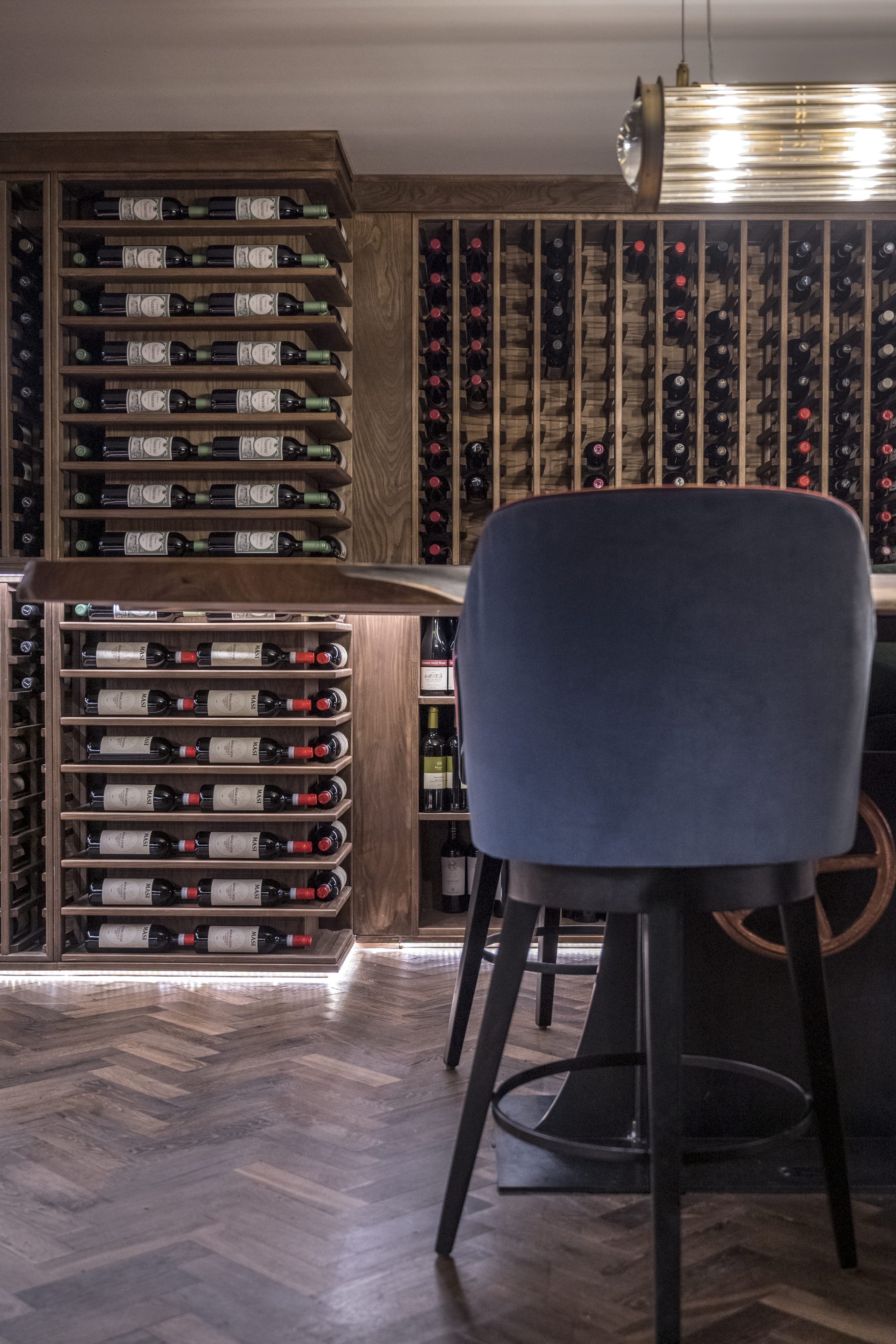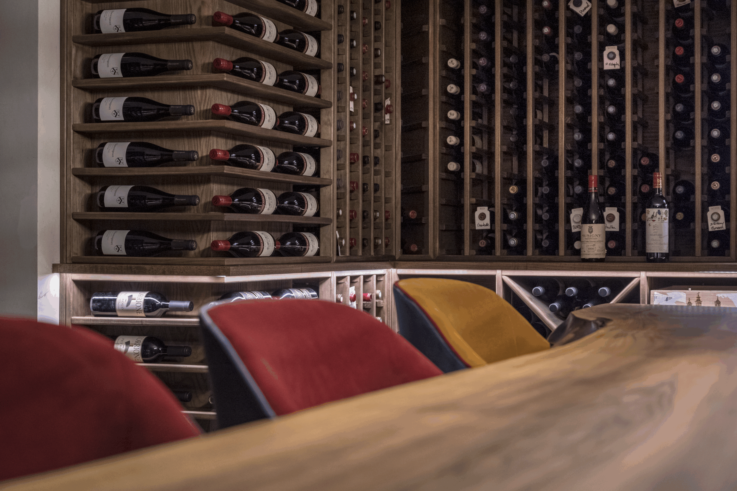 Crafted in natural oak, the racking includes a blend of standard bottle storage, angled display, and shelving for large formats—offering both flexibility and clarity. The layout was carefully designed to complement the scale of the table and the rhythm of the room, with integrated lighting to softly illuminate the bottles without overwhelming the space.