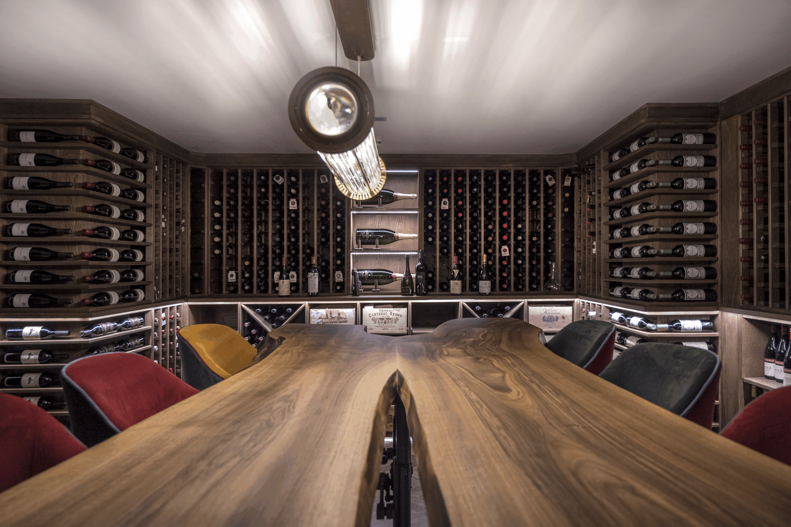 At the centre of the room sits a solid, natural-edged dining table, around which Sorrells installed 360-degree custom wine racking. The cellar is fully wrapped in joinery, creating a dramatic and immersive setting where every seat is surrounded by the collection.