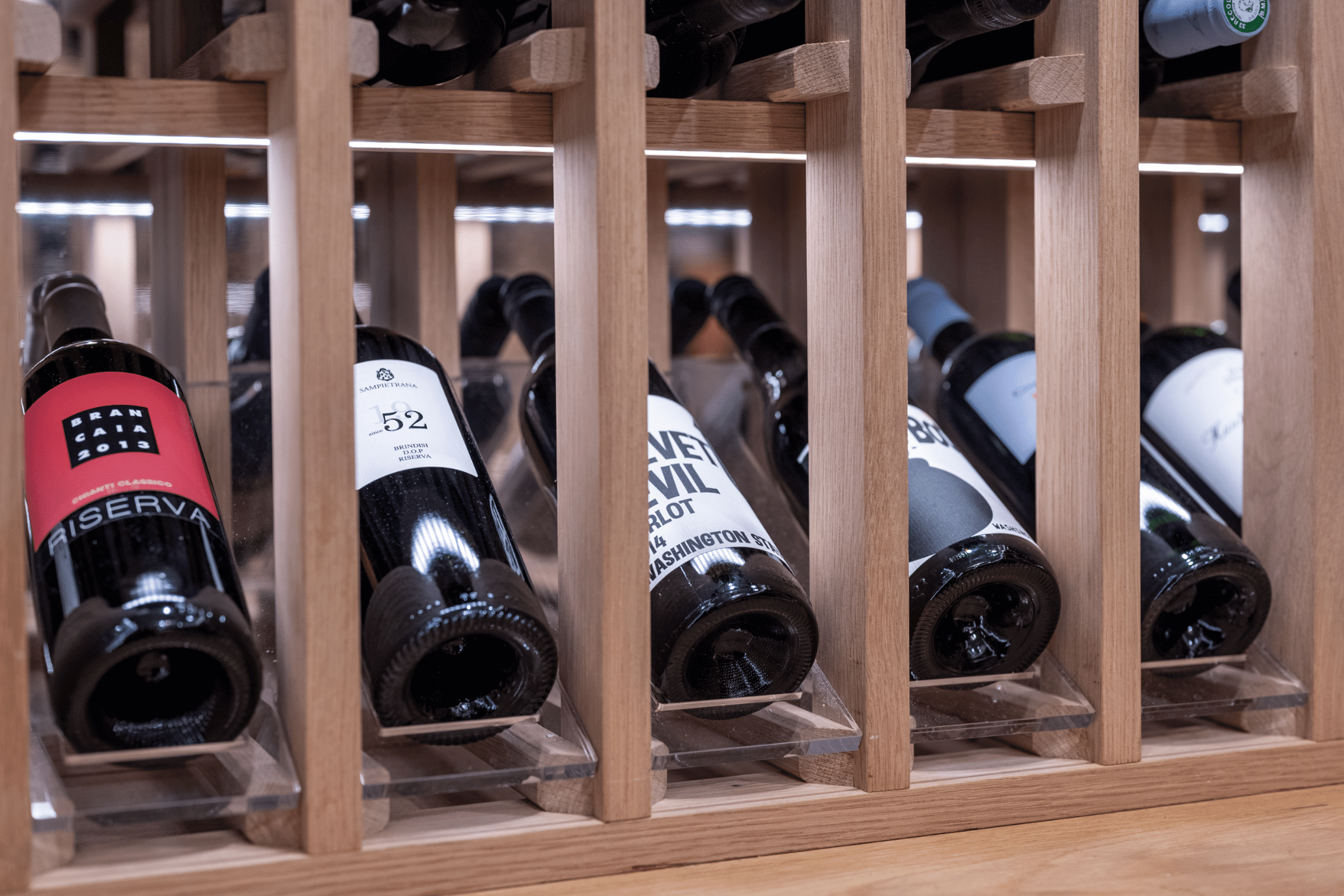 The choice of White American Oak as the primary material ensures a harmonious blend with the surrounding architecture while evoking an air of timeless charm. The distinctive grain patterns of the oak add a layer of character, complimenting the clay tile floor and creating a visually captivating experience for anyone who steps foot into the cellar.