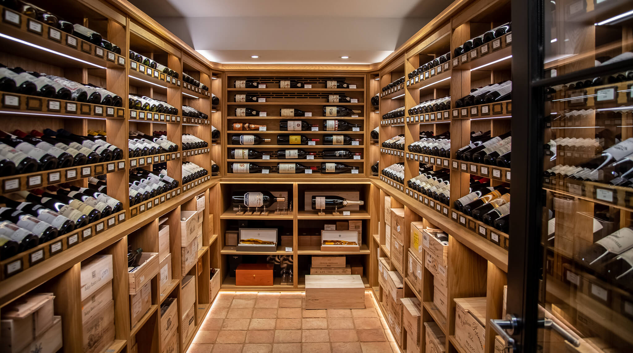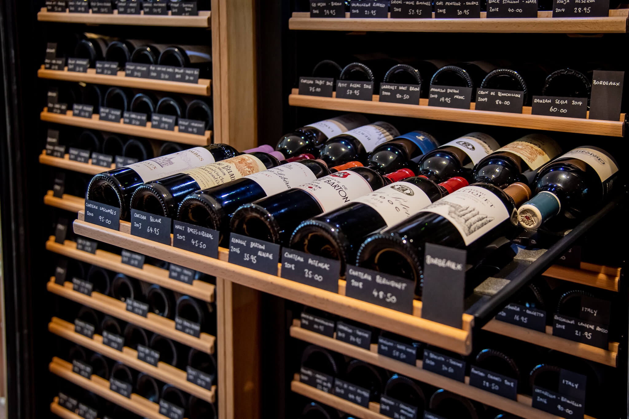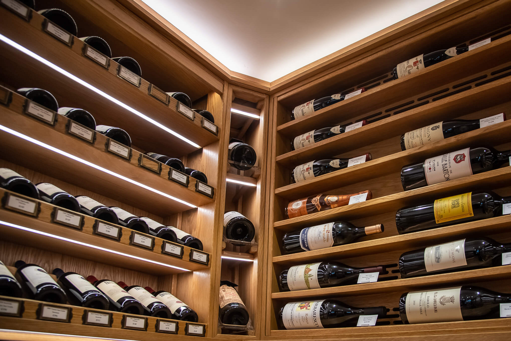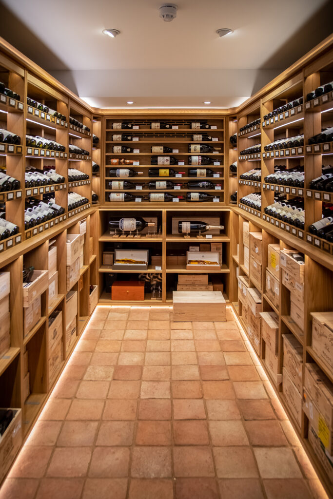 Bespoke racking in natural Hardwood Oak provides capacity for a diverse inventory, with dedicated bays for individual bottles and full case storage. Custom labels are integrated beneath each row, allowing the team to display pricing and wine details with clarity and flexibility. The cellar is fitted with a dedicated climate control system, calibrated specifically for the preservation of fine wine.