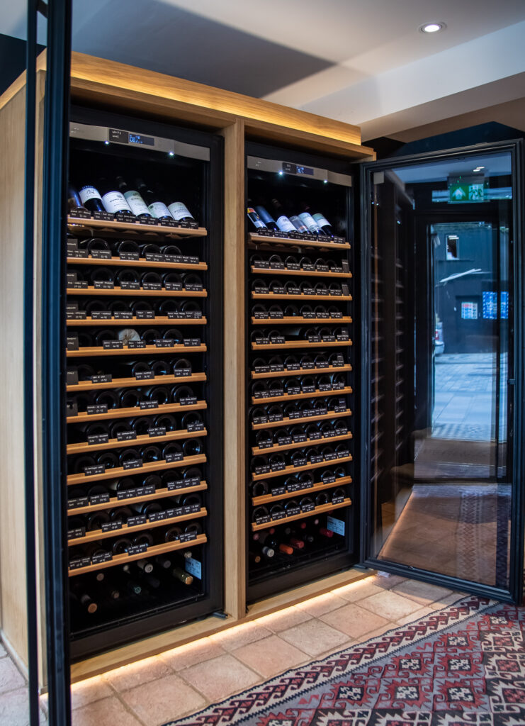 To add further temperature-controlled storage within the retail area, two Transtherm wine cabinets were supplied with opposite-opening doors for symmetrical access. Sorrells created custom joinery surrounds, allowing the cabinets to blend seamlessly into the shop’s interior scheme.